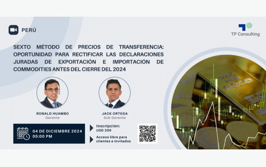 TP Consulting Peru is pleased to invite you to our upcoming webinar, “Sixth Transfer Pricing Method: Opportunity to Amend Commodity Export and Import Declarations Before the End of 2024. “