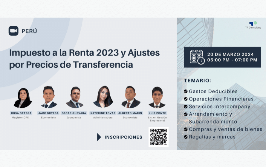 TP Consulting Perú invites you to participate in the webinar “Income Tax 2023 and Transfer Pricing Adjustments ,” where the following topics will be discussed: